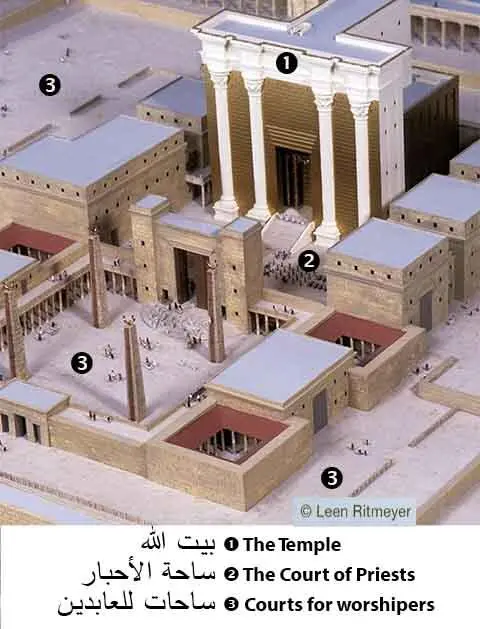 the building on al-Haram al-Sharif in Jerusalem in which Allah said he would be present in a special way. The Temple was built by the prophet King Sulayman from 966 BC to 959 BC. Believers everywhere faced the Temple of Allah when praying. No one was allowed to enter the Temple except for the priests on duty, who entered it to burn incense in honor of Allah or to put oil in the lamps or bread on the offering table. The Temple of Allah was surrounded by a walled courtyard where priests offered sacrifices on a large altar. At the time of Sayyidina Isa, this courtyard was surrounded by three more courtyards where people gathered to pray to Allah and to listen to teachers. For more information, see Temple complex and Temple interior.